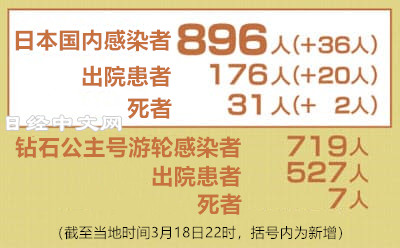 3月18日上午零時至下午10時,日本新增36人感染,累計確診896人,其中出院患者人數也累計達到176人,死亡人數新增2人,累計達到31人……