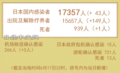 截至6月17日22時,當日新增43人感染。日本國內有46個都道府縣出現確診病例,累計為17357例。死亡人數新增1人,達到939人……