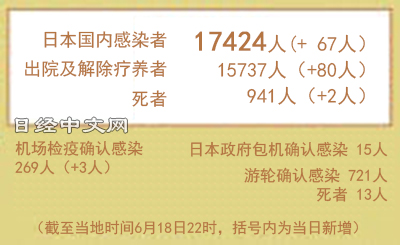 截至6月18日22時,當日新增67人感染。日本國內有46個都道府縣出現確診病例,累計為17424例。死亡人數新增2人,達到941人……