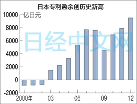 日本2012年「專利收支」(顯示的是利用專利和著作權等「智慧財産權」,能夠從海外賺取多大收益)順差額約達9528億日元,創出了歷史新高,比創歷史最高紀錄的上一年又高出約20%。不過,盈餘的大部分是日本企業從海外子公司收取的專利費等公司內部交易,日本要實現利用智慧財産權來盈利的「智慧財産權立國」目標,仍有很多課題有待解決。