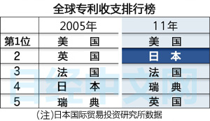 日本國際貿易投資研究所統計的2011年專利收支盈餘額排行榜顯示,日本僅次於美國,位列第2位。雖然盈餘額僅為美國的1成多,但卻是排在第3位的法國的約1.7倍。從2012年速報值來看,美、日、法的順序依然沒有改變。