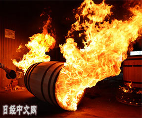 碳化木桶內壁的燒煙加工是決定酒熟化、顏色、香味的一道重要工序。在日本有明産業的工廠內,工匠毫不畏懼熊熊燃燒的火焰,徒手就將木桶橫放滾動,使內壁均勻受熱。他們還能根據燃燒情況以及聲音等準確判斷滅火時機……