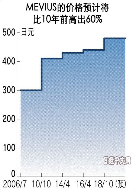 紙捲煙受原料價格上漲影響,漲價幅度將高於增稅幅度。日本煙草産業公司的主力品牌「MEVIUS」價格將上調40日元,漲至480日元(約合人民幣29.7元),「美國精神(Natural American Spirit)」的價格也將上調40日元至520日元(約合人民幣32.2元)。10年前 MEVIUS的售價為1盒300日元(約合人民幣18.6元),10月份漲價後價格將比10年前高出6成。