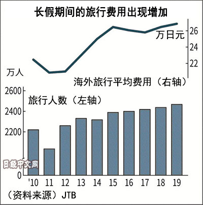 日本大型旅行社JTB于4月4日發佈的2019年黃金周旅游動向調查顯示,預計日本國內和出境遊人數將同比增加1.2%,增至2467萬人次,總消費額將同比增加3.7%至10610億日元,均創歷史新高。出境遊方面,去亞洲地區旅遊的人較多,同時由於伴隨著改元的十連休,歐洲也很有人氣。