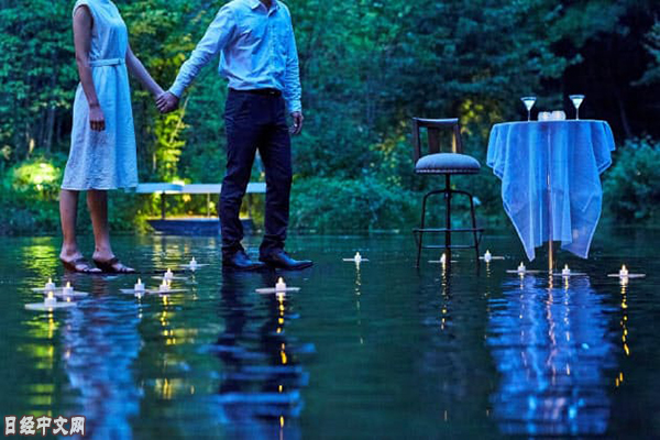 日本星野渡假村集團在長野縣輕井澤町的「虹夕諾雅 輕井澤」渡假村的酒吧裏設置了「水鏡涼臺」,使顧客可以體驗在水上小酌的愜意之感。渡假村在池塘上設置透明地板,上面放置桌椅,營造出涼爽的氣氛。