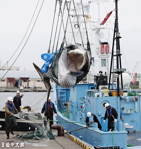 日本政府退出國際捕鯨委員會(IWC),7月1日,北海道網走市及和歌山縣太地町等沿岸捕鯨企業經營的5艘小型船隻從釧路港出發,前往釧路海域捕撈小鬚鯨。當天傍晚有兩頭小鬚鯨卸貨上岸,其中一頭為身長8米、重達6噸的雌鯨,被認為屬於小鬚鯨中的最大級別。