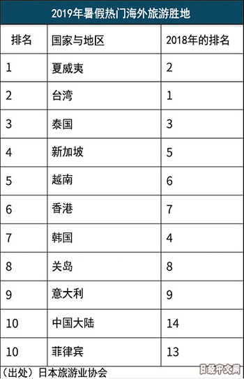 日本旅行業協會(JATA)發佈的2019年暑假人氣旅遊目的地排行榜顯示,夏威夷從去年的第2名重返第1名。圍繞夏威夷旅遊的競爭越來越激烈,全日本空輸(ANA)投入了全球最大的客機,日本航空(JAL)則與美國渡假村公司展開合作。大型航空公司的競爭推高了夏威夷的人氣。