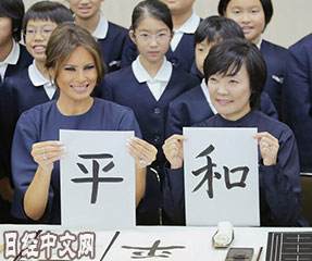 梅拉尼婭與安倍昭惠一起在東京的小學觀看書法課程,在聽學生解釋了毛筆的用法之後,書寫了「和平」的「平」字。之後與昭惠寫下的「和」字一起展示,露出了笑容……