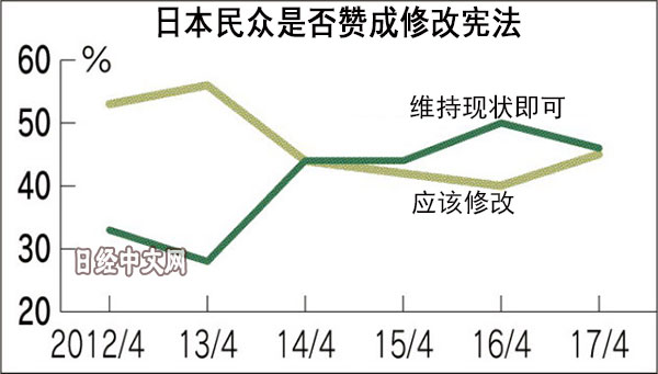調查顯示30~39歲、40~49歲和50~59歲三個年齡段的日本人超過5成支援修憲。而18~29歲和70歲以上的日本人中,維持現狀超過支援修憲……