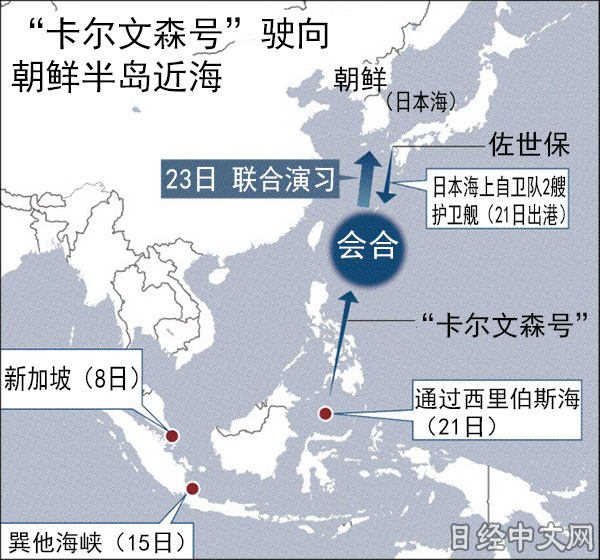 日本海上自衛隊出動了2艘護衛艦,訓練在西太平洋實施。卡爾文森號航母戰鬥群將邊實施訓練,邊朝著朝鮮半島航行。聯合訓練目的被認為是遏制朝鮮新的挑釁,但一般觀點認為很難期待效果……