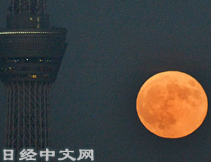 9月28日,世界各地觀測到了「超級月亮」奇觀。所謂「超級月亮」,是指月球在滿月的時候離地球最近,比平時看到的月亮更大更圓。當地時間晚間6點左右,東京天空樹東方的夜空中出現了紅色的超級月亮……