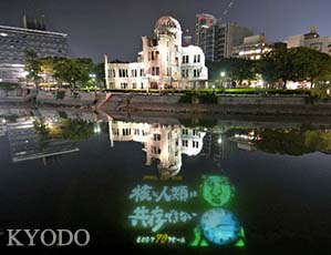 2015年8月6日是日本遭受原子彈轟炸70週年。前一日夜裏,流經廣島市原爆紀念館的元安川中,一幅控訴核危害的畫面映在水中。畫中人抱著一個時鐘,顯示著原子彈的投下時間。旁邊一行字是「核與人類無法共存」……