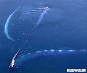 日前,日本一對年輕夫妻在赴福井縣越前町的漁港進行垂釣時拍攝到了兩條深海魚「皇帶魚」(俗名:龍宮使者)並排游動的情形。據看到照片的水族館負責人稱「皇帶魚成對出現的情況十分罕見,估計以前從未拍到過」……