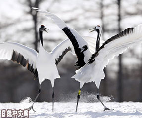 在位於北海道鶴居村的「鶴居·伊藤丹頂鶴保護區」的餵食區,日本國家特別天然紀念物丹頂鶴的遷徙迎來頂峰。在皚皚雪地上,雌性和雄性的丹頂鶴或拍打翅膀,或上下晃動脖子,跳著「求愛舞蹈」……