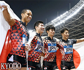 日本選手山縣亮太、多田修平、桐生祥秀、康橋飛鳥在男子4x100米接力決賽中以38秒16的成績輕鬆奪冠……