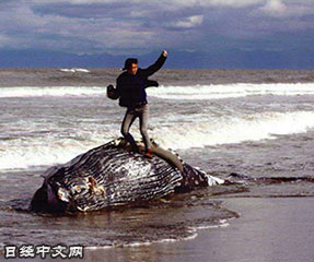 一名男性踩在被衝到海岸的鯨魚屍體上擺出勝利姿勢,這張名為《征服》的照片在北海道立鄂霍次克流冰科學中心主辦的攝影比賽中被評為最優秀獎。但照片內容引起了很大的爭議……