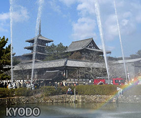 1月26日是日本「文物防火日」,位於奈良縣斑鳩町的世界遺産法隆寺舉行了防火演練。約有100名僧侶參加了此次演練。他們用水泵抽取寺內的境池的池水進行噴射,場面很是壯觀……