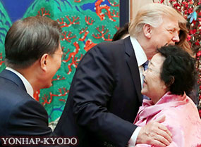 文在寅邀請前日本軍隊隨軍慰安婦李容洙參加歡迎川普的晚宴,川普與之擁抱並握手。席間還用日韓存在主權爭端的竹島(南韓名:獨島)近海捕撈的蝦招待了川普……
