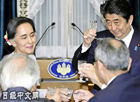 安倍破格接待緬甸外長翁山蘇姬,安倍急於加強與緬甸的關係出於政治與經濟兩個方面的考慮,都與中國有關, 但巧合的是,緬甸國防軍總司令敏昂萊正在中國訪問……