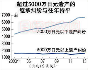 2013年的約9000起繼承糾紛中,5000萬日元以下遺産的案件約有6700起。與2003年的不到4400起相比增長了50%以上。而超過5000萬日元的案件方面,2013年為1684起,與2003年的1692起相比幾乎沒有變化。