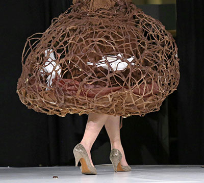 | 模特身穿形似樹根,又像鳥籠的巧克力裙子走秀(UPI-KYODO) |