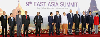 | 出席東亞峰會的各國領導人,左起第3人為安倍晉三,中間穿白色民族服裝者為緬甸總統吳登盛,兩邊分別是李克強和歐巴馬 |
