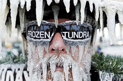 | 站在美國威斯康辛州一處橄欖球場外的被「冰凍」的美國男子(12月9日,AP) |
