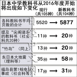 日本政府要求在教科書中稱尖閣諸島(編者注 中國名為釣魚島)和竹島(南韓名為獨島)為日本「固有領土」,這是首次寫入社會課的所有教科書(20種)。此外有關東日本大地震的表述也將增多。