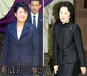 | 參拜靖國神社的女性活躍擔當相有村治子(左)和綁架問題擔當相山谷惠理子(右)(23日上午,東京九段北) |