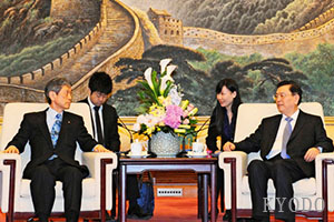 | 5日,在北京人民大會堂舉行會談的日本自民黨副總裁(左)與中國全國人大常委會委員長張德江(kyodo) |