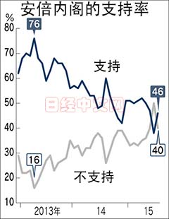 日本經濟新聞(中文版:日經中文網)與東京電視臺於8月28~30日聯合實施的輿論調查顯示,安倍內閣支持率較7月份上次調查上升了8個百分點,恢復至46%。不支持率下降了10個百分點至40%。7月份上次調查時,安倍內閣自2012年12月上台以來首次支持率低於不支持率,不過8月支持率再次超過不支持率。