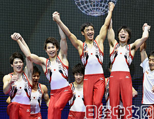 | 奪冠後的日本體操男團運動員(28日,kyodo) |