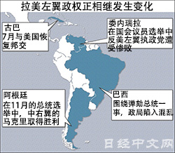 拉丁美洲的左翼政權開始籠罩陰影。阿根廷政權將於12月10日從中左翼交至中右翼手中。而在6日實施委內瑞拉國會議員選舉中執政黨大敗。從已故前總統查維茲以來執政的反美左翼政權陷入困境。此前,該政權利用資源出口獲得的外匯,一直在推行普遍惠及低收入階層的政策,但隨著資源價格的下跌,其國內經濟陷入低迷,支援階層也出現分化。