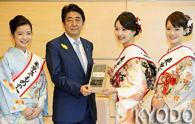 | 安倍接受「東京和服女王」贈送的和服腰帶 |