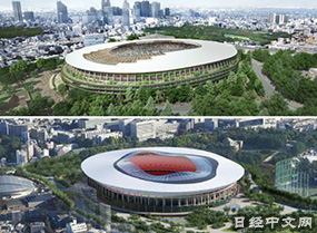 | A方案(上)和B方案(下)的新國立競技場效果圖 (日本體育振興中心提供) |