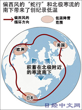 據美國氣候預測中心分析,北極進入今冬以後一直保持寒流可輕鬆蓄積的狀態,但進入1月以後開始轉為釋放。這時,剛好碰到了比平時移動幅度更大的朝南北方向彎曲行進的偏西風。