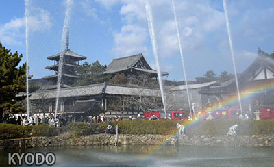 | 在世界遺産·日本奈良的法隆寺舉行的防火演練(26日上午,奈良縣斑鳩町) |