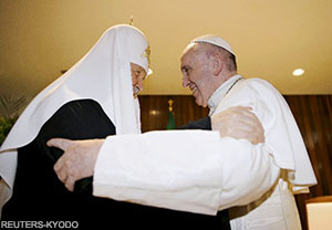 羅馬天主教教宗方濟各(Pope Francis)和俄羅斯東正教大牧首基里爾2月12日實現了歷史性會晤。羅馬教廷(教廷)尋求通過與其他宗教和宗派的和解來加強影響力,而俄羅斯東正教則希望在東正教中鞏固盟主的地位。在高舉保護基督教徒免受極端組織迫害的「大義」下,雙方上演了閃電式的和解,但在其背後是烏克蘭局勢等地緣政治上錯綜複雜的緊張局勢。