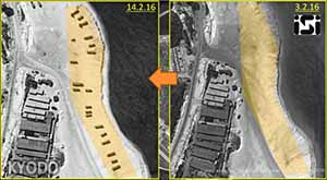 | 圖冊右側為西沙永興島2月3日的圖像,左側為2月14日的圖像(ImageSat International N.V.-kyodo) |