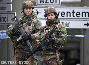 | 部隊在通往比利時國際機場的道路上警備(24日、REUTERS-KYODO) |