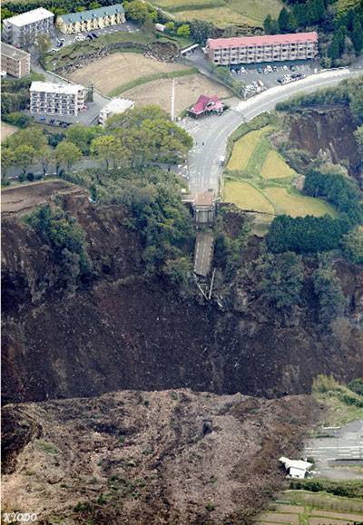 | 因地震土石流遭到破壞的阿蘇大橋(4月16日,南阿蘇,KYODO) |