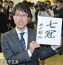 | 手拿自己書寫的「七冠」字樣彩紙、笑逐顏開的井山裕太(20日,東京都千代田區) |