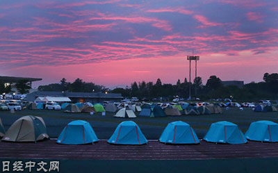 | 日本登山家野口健在熊本避難所周圍設置的帳篷村,呼籲在車中露宿的災民入住(4月25日,熊本縣益城町) |