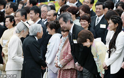 | 東京大學宇宙線研究所教授梶田隆章(前排右起第三人)在與天皇夫婦交談(4月27日,東京赤坂御苑) |