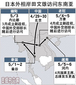 日本外相岸田文雄以5月3日訪問緬甸為開端,將相繼訪問寮國、越南等東南亞國家。這國家都在近期剛剛更換了政府或領導層。出於對希望接近相關國家新政權的中國的警惕,日本將加緊構築與各國的關係。將提出符合對象國期望以及國情的經濟增長和民主化方面的援助,強調作為夥伴的「低姿態」,以顯示與中國的大規模援助的區別。