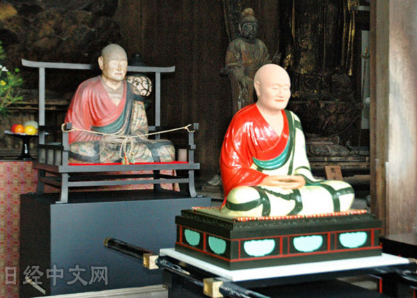 | 在中國製作的鑒真大師新像(右)與唐招提寺的鑒真像(2013年複製品)「對面」 |