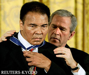 | 美國前總統小布希向阿里授予「總統自由勳章」(2005年11月,美國白宮,reuters-kyodo) |