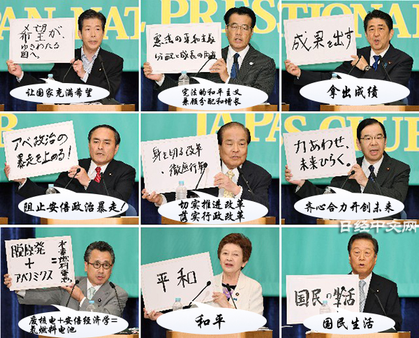 | 上方第一排自右向左分別為:日本自民黨總裁 安倍首相、民進黨 岡田代表、公明黨 山口代表 第二排自右向左:共産黨 志位委員、大阪維新會 片山共同代表、社民黨 吉田黨魁 第三排自右向左:生活黨 小澤共同代表、珍惜日本之心黨 中山代表、新黨改革 荒井代表 |