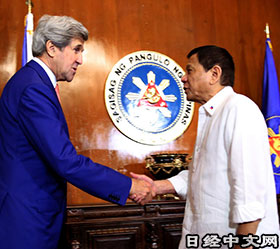 | 迎接美國國務卿克里(左)的杜特蒂總統(27日,馬尼拉)(圖由菲律賓總統府提供) |