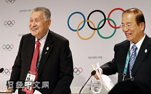 | 在國際奧會大會決定新增項目後舉行記者會的東京奧組委會長森(左)等(3日,里約熱內盧) |